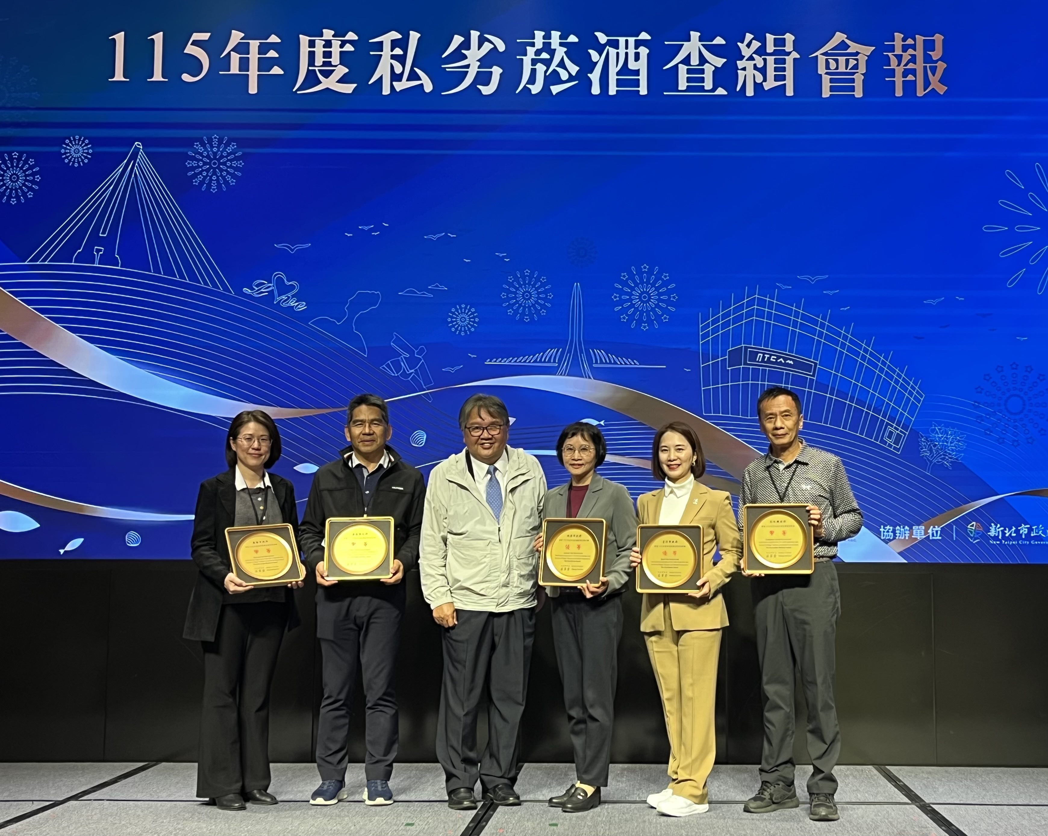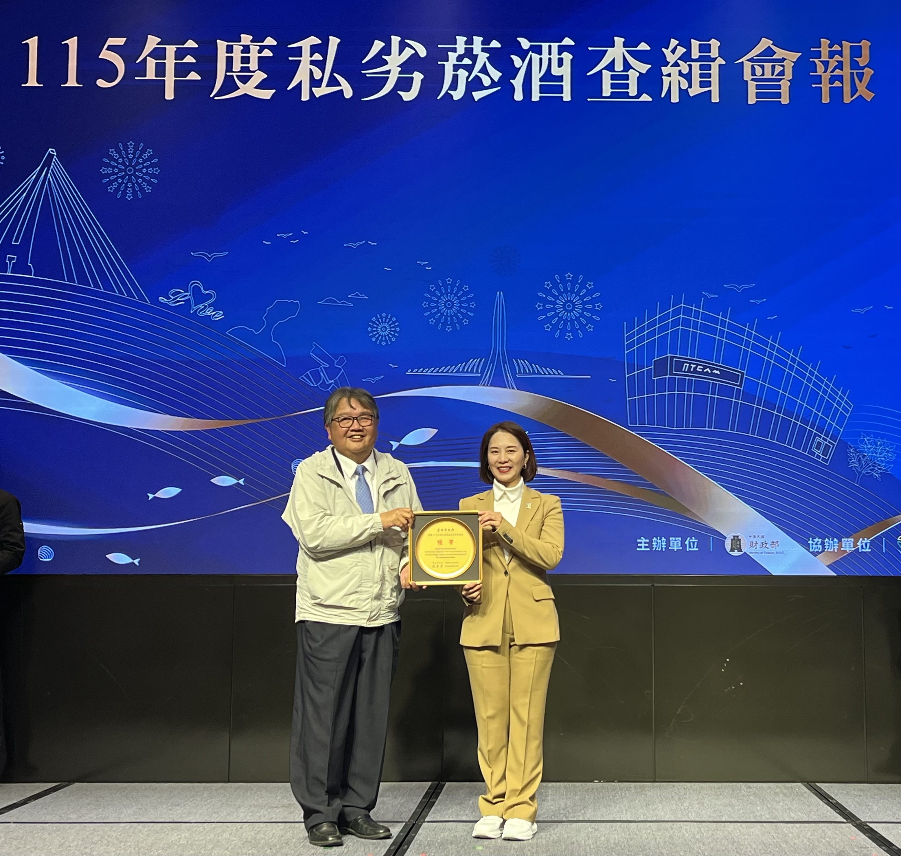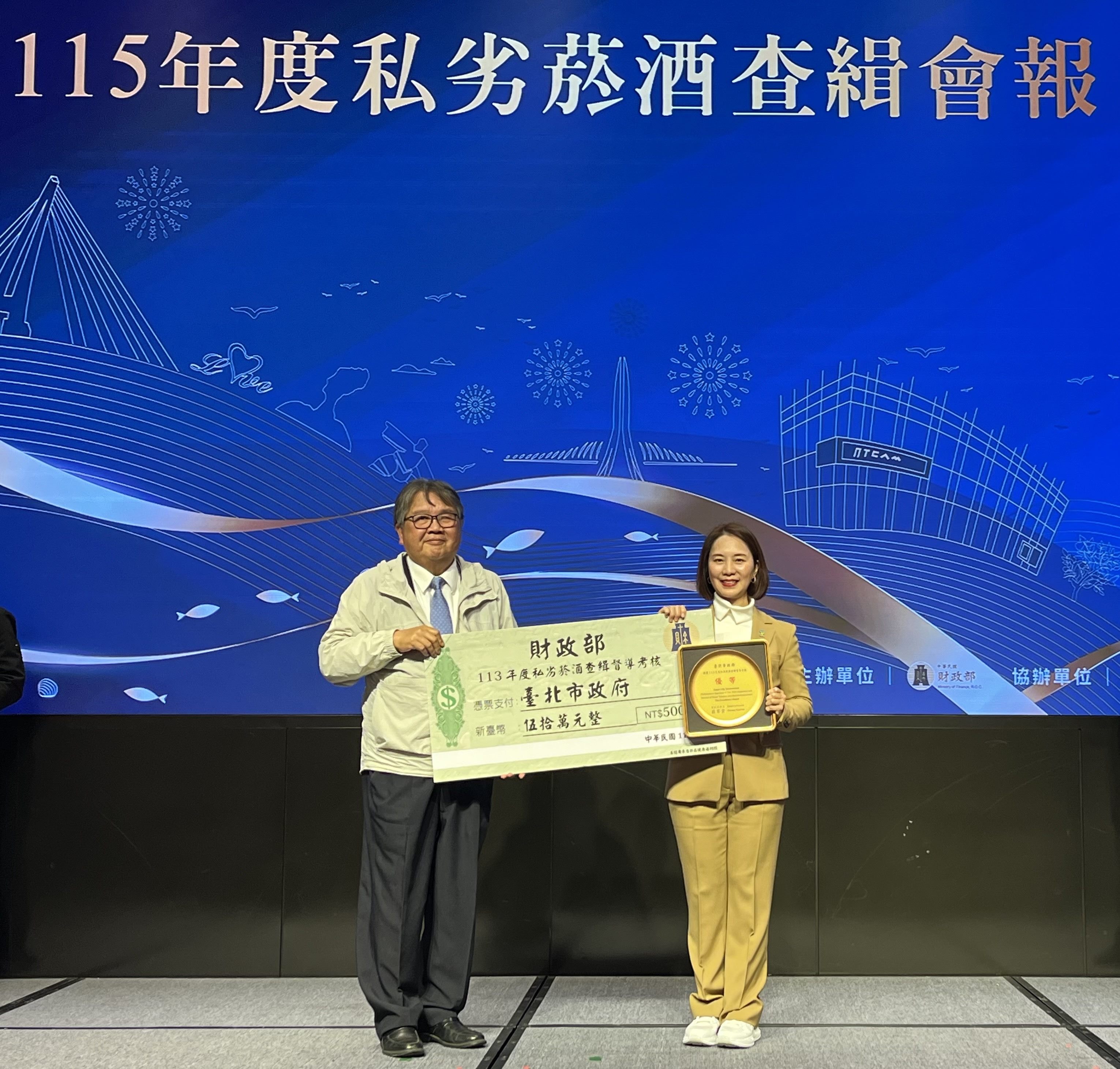 臺北市政府財政局於115年1月22日(星期四)出席財政部舉辦「115年度私劣菸酒查緝會報」,獲頒113年度私劣菸酒查緝考核績效優等,成果卓越。 本次查緝會報由財政部戴龍輝主任秘書主持,與會機關除邀請財政部國庫署、關務署、賦稅署及五區國稅局外,並邀請海洋委員會海巡署等相關查緝機關,以及各縣市政府菸酒主管機關之代表參加,共同擘劃精進私劣菸酒查緝作為。本次特別表揚113年度私劣菸酒考核績優機關,臺北市政府榮獲考核成績優等。 財政局胡曉嵐局長表示,臺北市屬商業活動蓬勃發展之都會地區,菸酒消費樣態多元,財政局查緝同仁積極查緝網路販售私菸酒及轄內菸酒業者之抽檢業務,杜絕違規菸酒,以維護市民健康。此外,財政局更積極與各查緝機關業務交流及加強橫向聯繫,並適時會同各查緝機關辦理聯合查緝私劣菸酒任務,共同守護菸酒市場秩序。